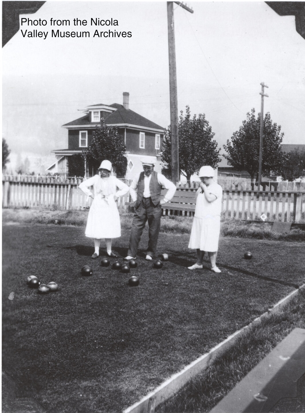 On Monday May 25th, 1925, Merritt’s first Lawn Bowling Green was opened on James Fairley’s Property on Nicola Avenue. The Merritt Herald listed the price for a seasonal membership as $15 for men, $12.50 for women, and 25 cents per hour for non-members (In today’s money that would be $220, $185, $4/hour respectively). Lawn Bowling was described as a “splendid, healthful sport suitable for persons of any age.” The opening of the Bowling Green was well attended, and featured people such as Dr. J.J. Gillis, Percy Scott, Bob Irving Sr., Bob Drybourgh, Howie Laidlaw, and Bob Hogg. The photo of the opening ceremony is pictured below.